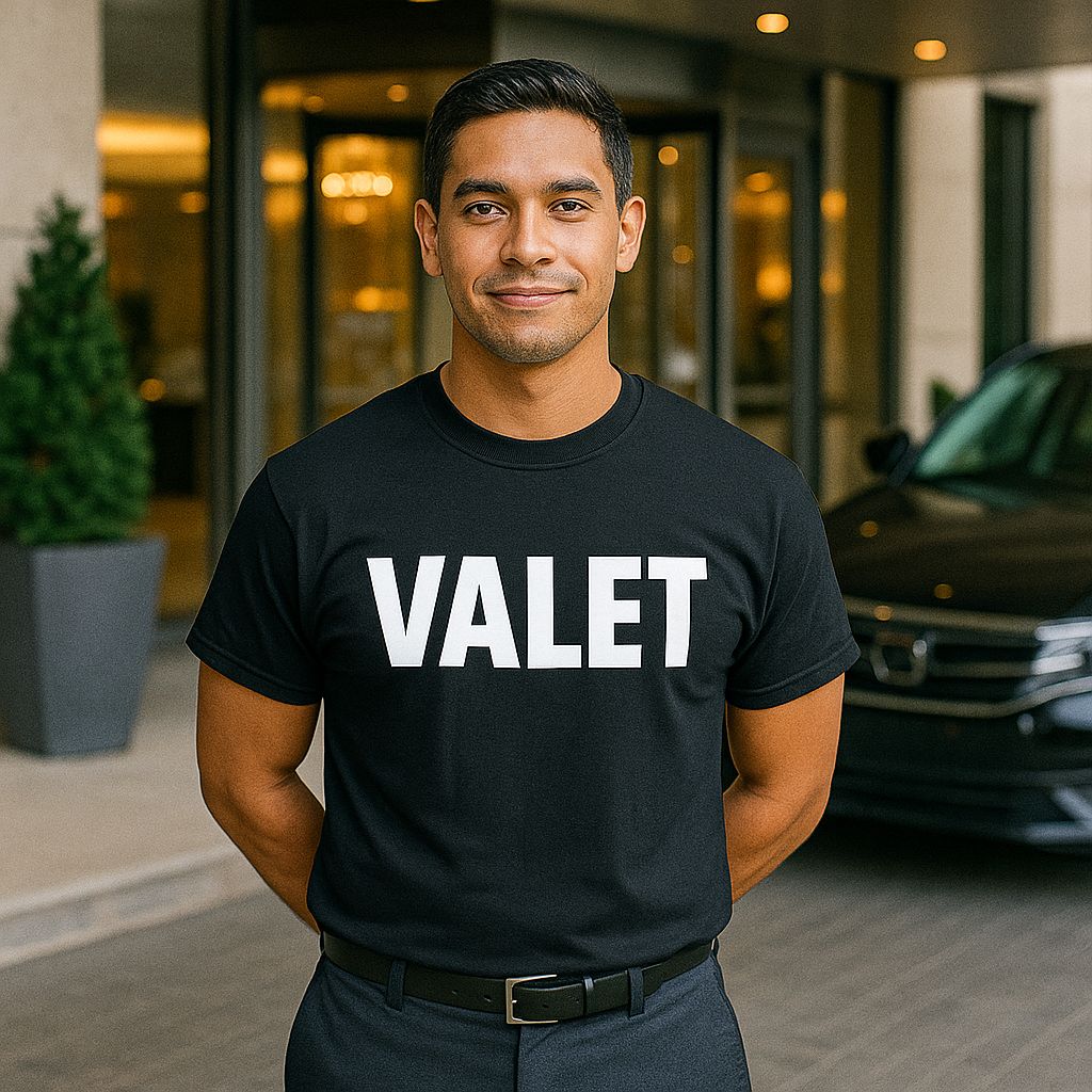 This Unisex Cotton Valet Printed T Shirt is a professional choice for workwear. The black tee features a clear white valet print on both the back and front, making it highly visible and perfect for your job. This shirt is a size 3X-Large.
